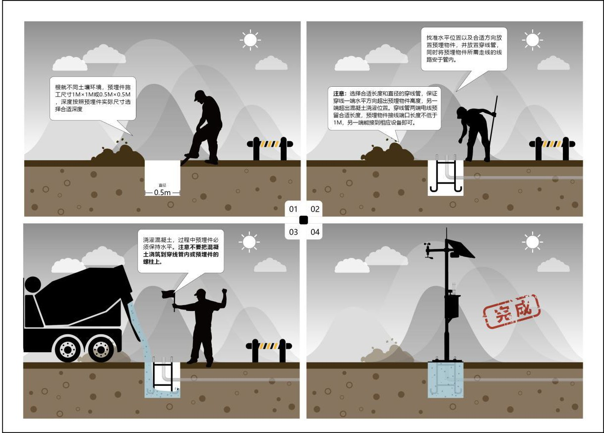 3、布線,根據訂單需求提前合理布線,包括電源線。如需要布線,澆筑混凝土前,需要先放置穿線管,常規為PVC材質的塑料管,直徑根據供電線纜尺寸自定。穿線管需高于預埋件中心預留孔5cm,另一端以能接到相應設備處為標準。